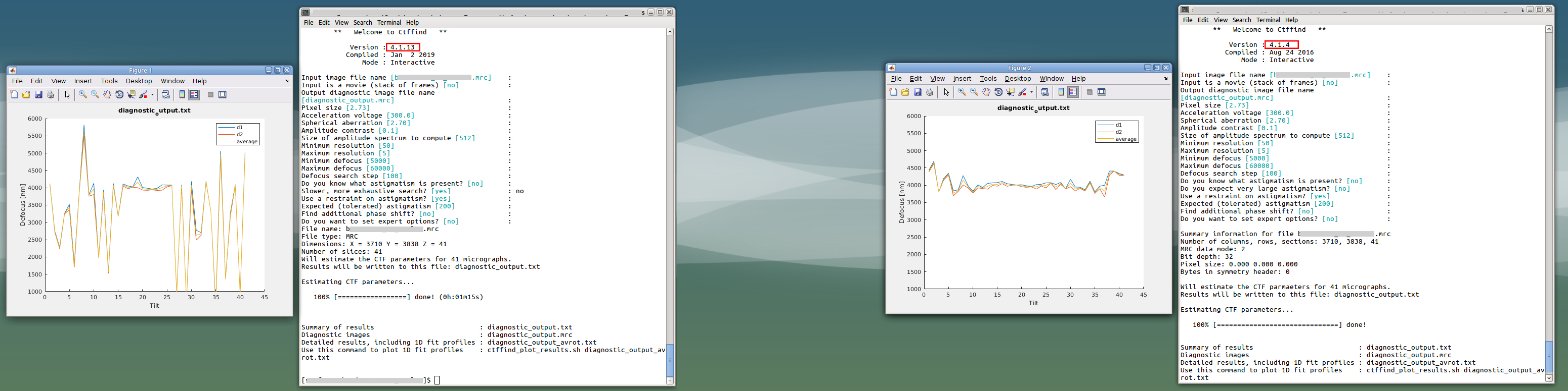 Details: I am estimating the defocus of a tomographic tilt series. Each tilt image was drift corrected but not dose-weighted. The target defocus was 3.5um. Around small tilt-angles the estimation seems ok. At higher tilt angles the 4.1.13 version is completely off while the 4.1.4 version gives good results. I am using the same parameters that gave good results on many other tilt series. You can find details about the chosen parameters and a plot of the defocus in the attached image (the tilt numbers 1-41 in the plots represent the tilts from -60 degrees to +60).